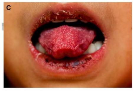 5.口唇和口腔改变:包括口唇红、干燥、皲裂、脱皮和出血,草莓舌,口咽黏膜弥漫性充血。