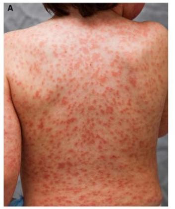 1. 猩红热:川崎病亦可出现猩红热样皮疹,但单纯的猩红热感染多数对抗生素治疗有效,抗生素治疗后症状改善,炎性指标明显下降。