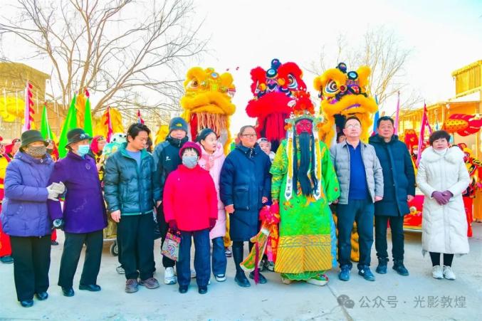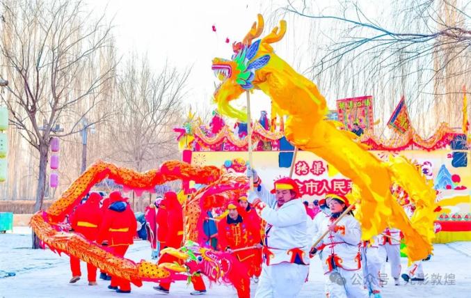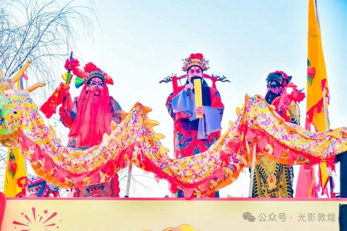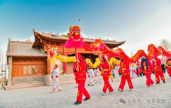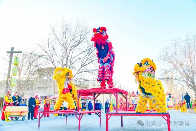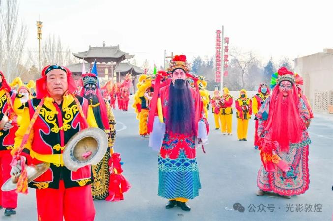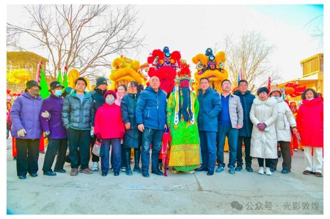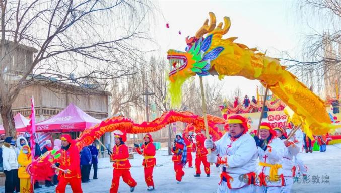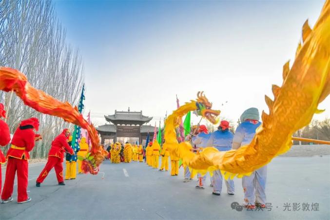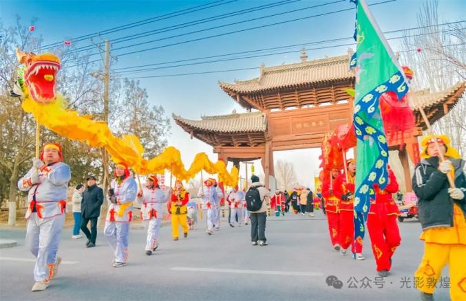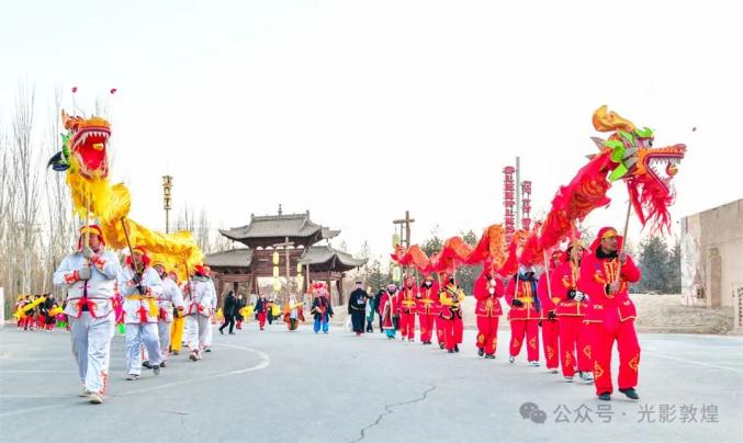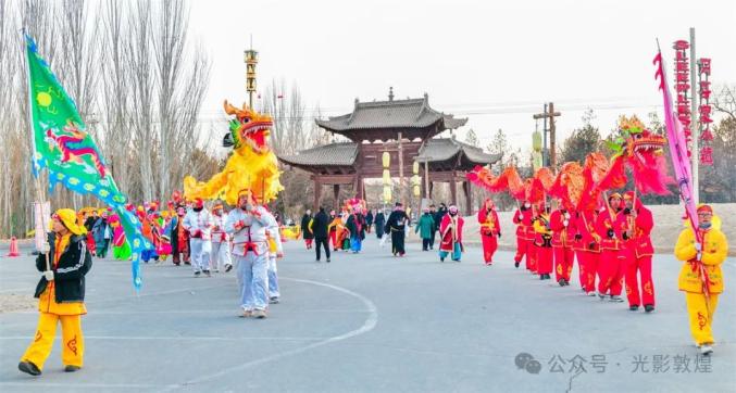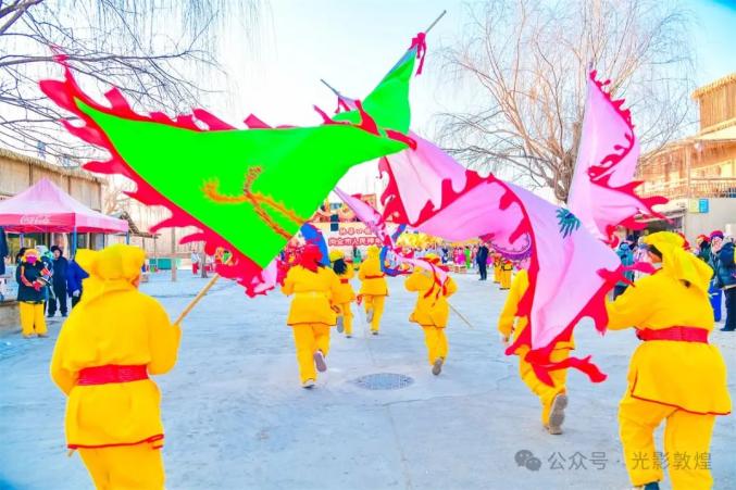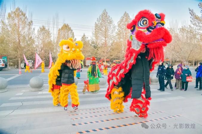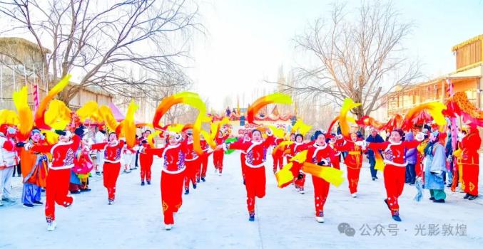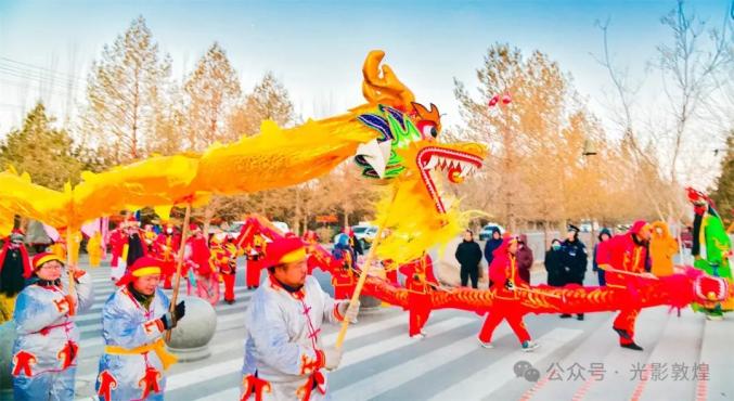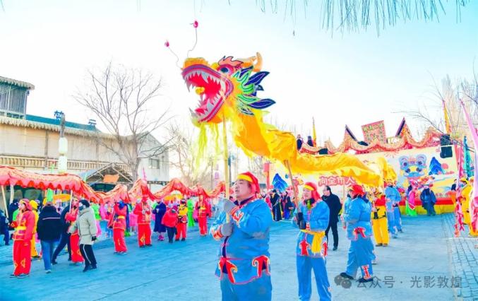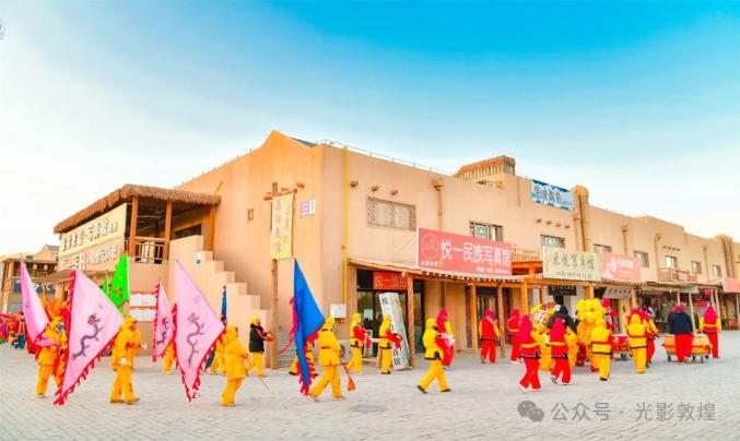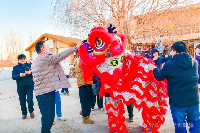 来自敦煌市转渠口镇社火队的200余名社火队员身着盛装,敲响震天的锣鼓,舞长龙、耍狮子、扭秧歌……在鞭炮声中浩浩荡荡地进入月牙泉小镇,穿过古色古香的街巷,在中心街广场集结,市民游客在欢歌笑语中感受着浓浓的节日氛围和民俗文化魅力。