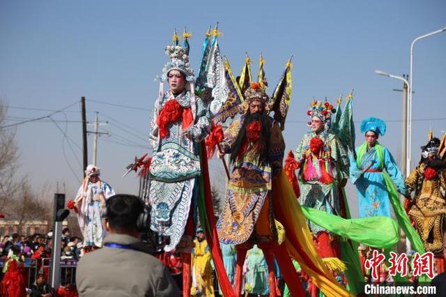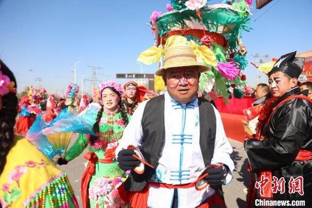 不点花灯月不圆,不耍社火难过年。2月9日,农历正月十二,青海省西宁市大通回族土族自治县10支优秀社火队进城巡演。图为传统社火表演。中新社记者 张添福 摄
