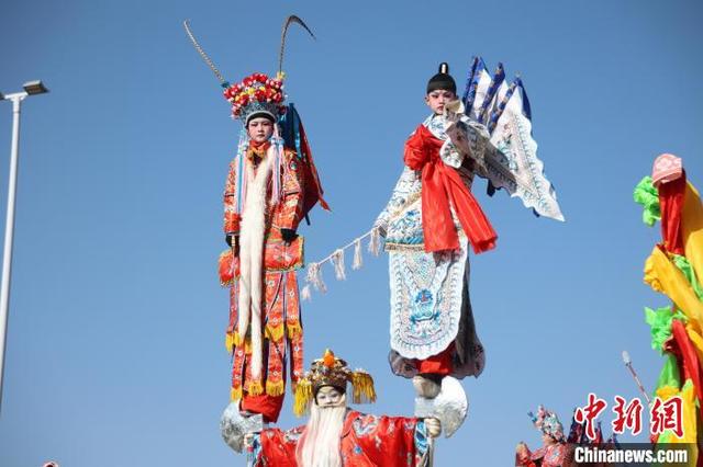 不点花灯月不圆,不耍社火难过年。2月9日,农历正月十二,青海省西宁市大通回族土族自治县10支优秀社火队进城巡演。图为踩高跷社火表演。中新社记者 张添福 摄