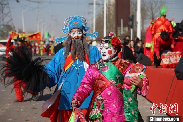 不点花灯月不圆,不耍社火难过年。2月9日,农历正月十二,青海省西宁市大通回族土族自治县10支优秀社火队进城巡演。图为踩高跷、矮跷社火表演。中新社记者 张添福 摄