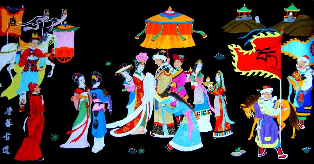 湟中堆绣作品《唐蕃古道》描绘的是文成公主进藏时在青海日月山脚下的迎娶盛况。作品采用湟中堆绣中的平面堆绣也叫“平堆”,把剪好的绸缎块平贴拼合在刺绣的布料上,然后稍加渲染,产生立体效果,画面平展匀净、色彩艳丽、工艺精湛。