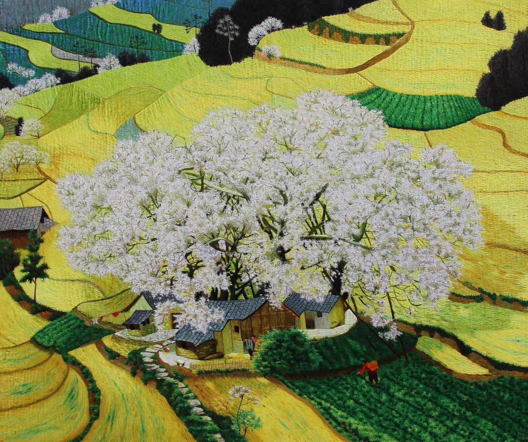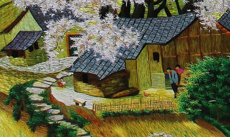 《金银满农家》由传承人闫永霞与画家彭享华合作,运用交叉重叠多层的大乱针、小乱针和树杈针等乱针技法,在绣面上表现了一幅三月巴渝乡村画面。