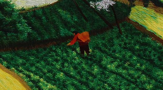 金灿灿的油菜花开满田间地里、银子般的梨花挂满枝头,梨花树下幽静的老屋、田间地里劳作的农民和带孩子的老人等组成一幅和谐的乡间美丽画卷,故取名“金银满农家”。