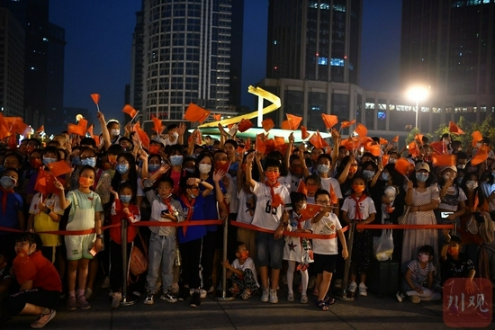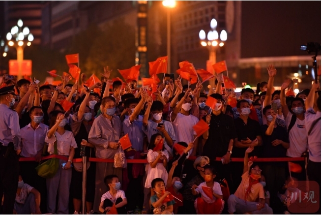 此时,庄严的天府广场上,鲜艳的五星红旗高高飘扬,现场爆发出热烈的掌声和巨大的欢呼声。“我爱你中国”“祝伟大祖国繁荣昌盛”声此起彼伏,在一些市民的带动下,大家还唱起了《我和我的祖国》,不停挥舞着手中的国旗,表达对伟大祖国的诚挚热爱与美好祝福。