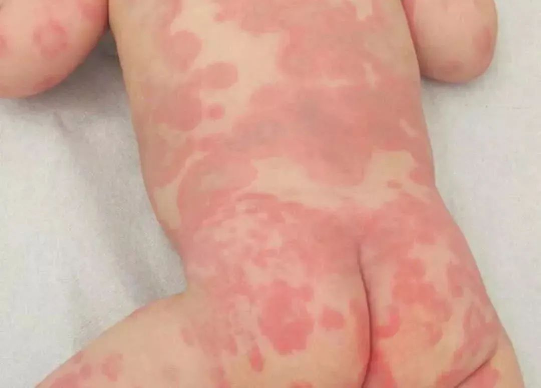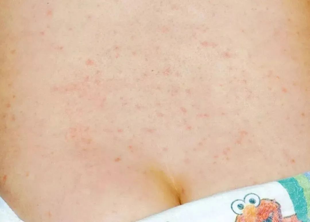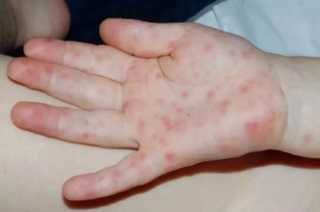 最初是脸上长皮疹,1 天之内皮疹就会蔓延到孩子的脖子、躯干、脚和手掌。