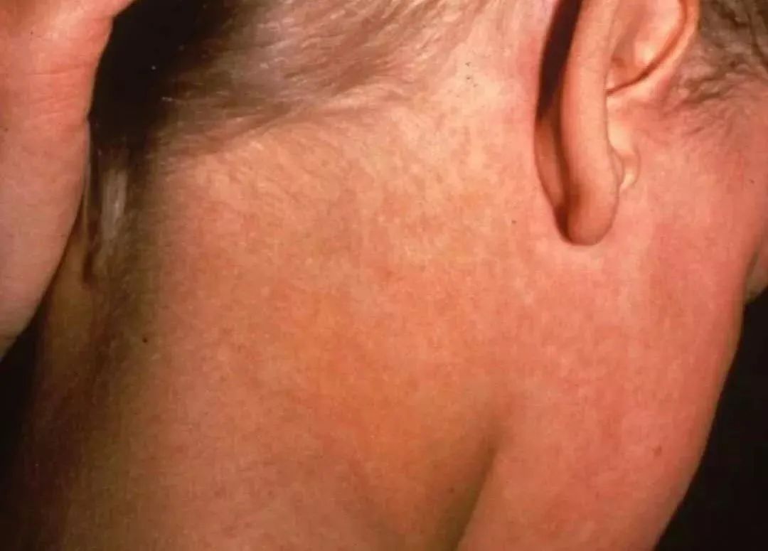 皮疹为红色的斑丘疹,用手指轻轻按压会褪色,大概 7~10 天后痊愈。