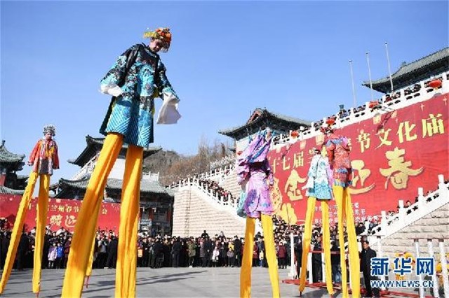 2月6日,民间艺人在兰州文化庙会上表演踩高跷。(新华社记者陈斌 摄)