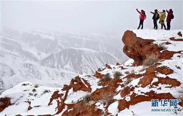 2月9日,游客在甘肃张掖肃南裕固族自治县祁丰藏族乡青稞地村游览。新华社发(王将 摄)