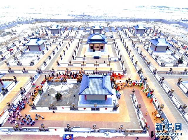 这是航拍的张掖市甘州区碱滩镇古城村的“九曲黄河灯阵”。新华网发(成林 摄)