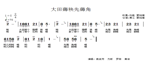 薅秧歌歌词以二二三节奏的七言句式为主,一首歌大都为四句,第一句常与薅秧场景有关,如“大田薅秧先薅角”“脱了花鞋拖过脚”等,其余几句由第一句引发。恩阳薅秧歌的声腔高亢豪放,调式灵活多变,旋律婉转悠扬,节奏相当自由,能够把劳动人民的粗犷旷达、艰苦卓绝的性格表现得淋漓尽致。