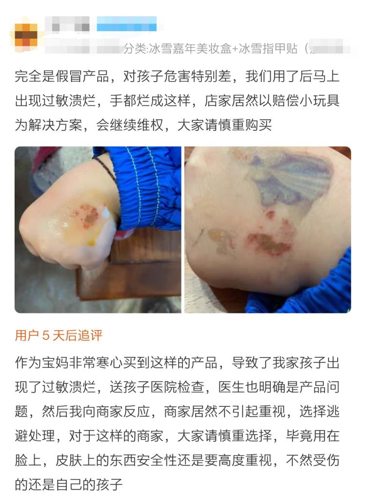 但通过购买评论发现,不论是商场同款的还是其他网店在售的化妆品套盒,基本都出现了关于儿童使用后过敏的图文反馈。孩子的皮肤红肿,甚至出现溃烂。部分家长对化妆品质量提出质疑,并向商家维权。