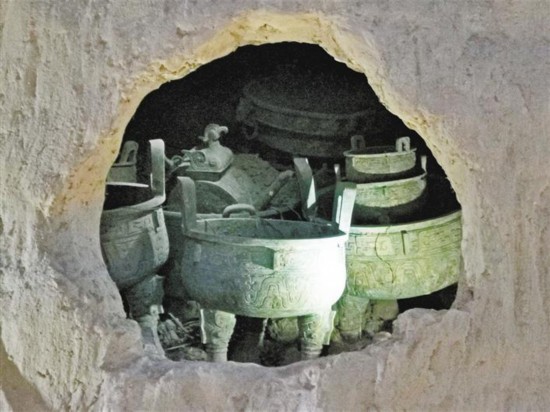 杨家村窖藏出土的27件青铜器,件件有铭文,总字数达4000多字。图为宝鸡青铜器博物院复原的杨家村窖藏。