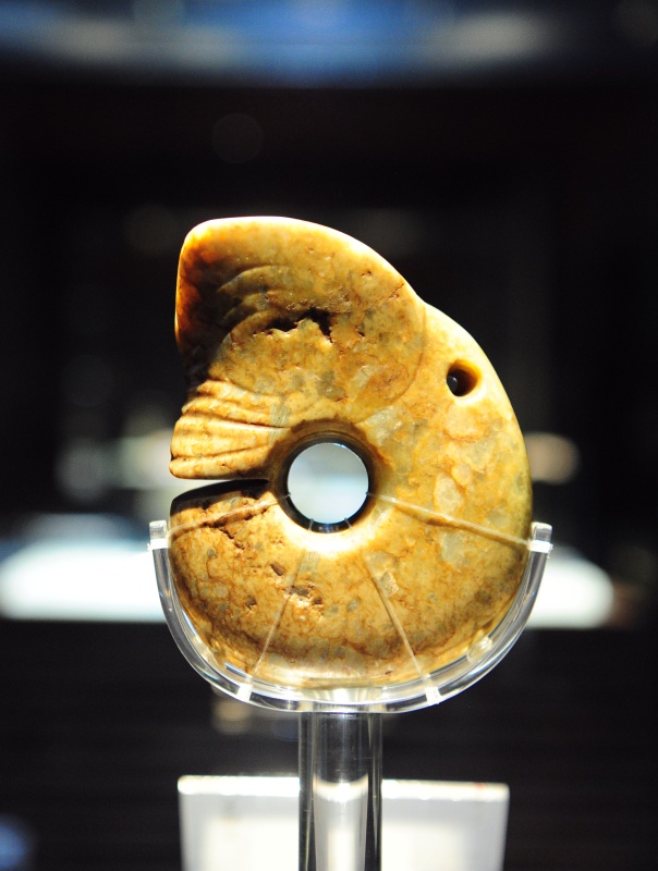 梁带村芮国遗址博物馆内展出的玉猪龙(3月7日摄)。