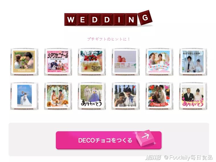 Decocho官网展示的部分个性化定制蒂罗尔巧克力产品,主题分别是“婚礼”“宝宝”和“自制插画”。