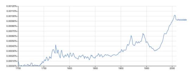 用数据说话,下图来自Google Ngram的数据——Ngram的数据来自谷歌520万本数字化图书的词频统计,搜索词为chocolate(巧克力)。