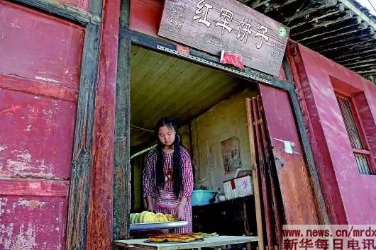 ▲在哈达铺镇红军街,一名女孩在出售“红军饼子”。新华社记者马宁摄
