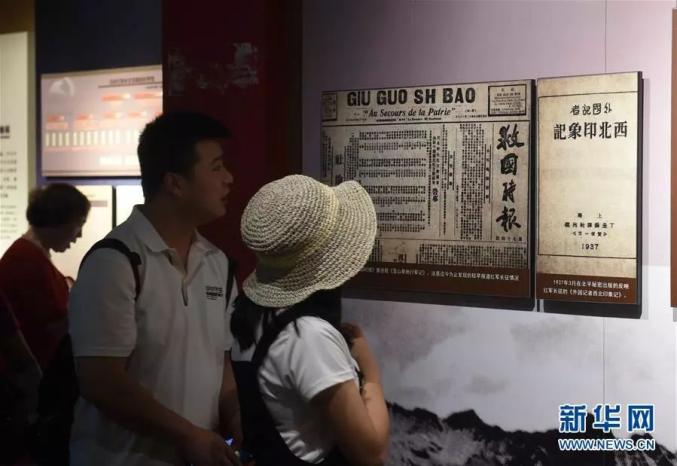 ▲8月16日,在红军长征哈达铺纪念馆展厅内,观众参观展出的较早报道红军长征情况的报纸《救国时报》。新华社记者 罗晓光 摄