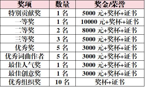 注:以“团体”名义参赛获奖者如:“合唱”形式参赛者获得名次以“团体”名义荣获奖项。(本次大赛所有奖金均为税前)