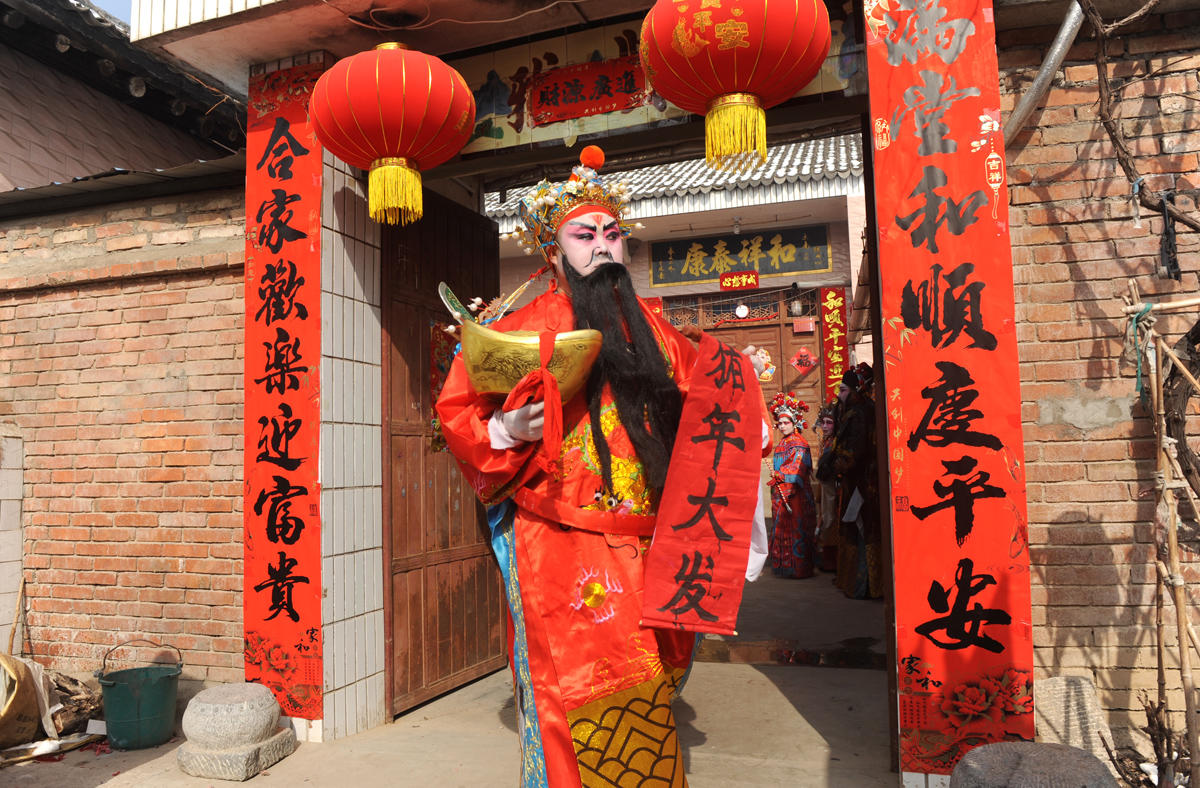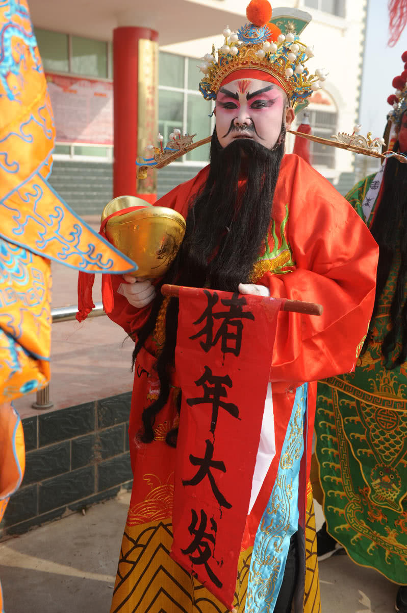 马鹏在社火队里扮演的是财神爷,只见他右手捧着金元宝,左手提着“猪年大发”的祈福条幅,略显富态地走在黑虎、灵官的后面。如果有人家邀请,他是必须要到人家院子中去转上一圈的人物。
