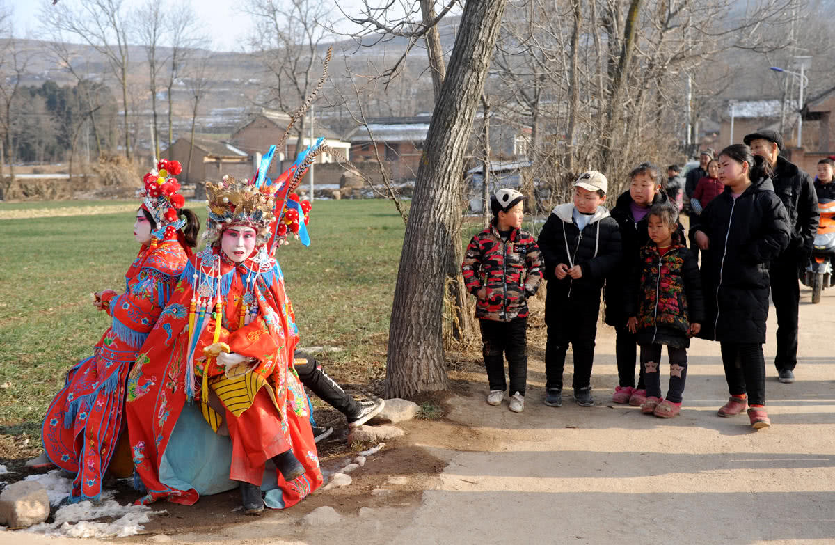一个村子转完,社火队又沿着雪后的乡村路前往下一个村庄。村外两名妇女在路边的水沟旁洗衣服,即便是热闹的锣鼓声也没有引起她们的特别关注。马鹏说,因为每年都有社火,大家已经习惯,把这当成了过年的一部分,来看社火的大都是外地人。
