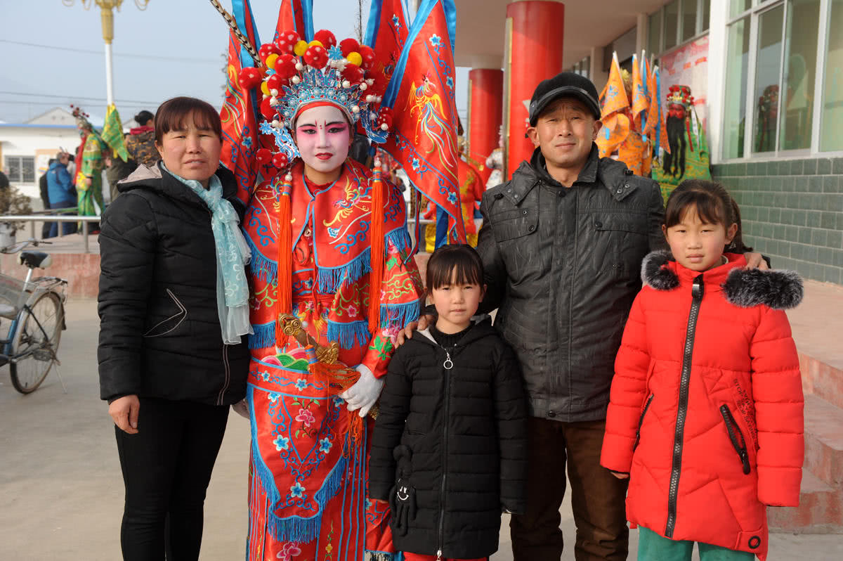 上初一的安英,是社火队伍中年龄最小的演员,扮演历史上的一名女英雄。“参加社火表演既是一种传承、一种荣誉,更是一种锻炼,我们让她参加就是想让她体验一下。”安英的母亲说。她和丈夫经常外出打工,和家里的仨孩子离多聚少。安英作为家里的大孩子,经过体验和锻炼,会更早地懂事,帮助家里照顾弟弟妹妹。图为穿戴整齐后的安英在演出开始前和家人合影。
