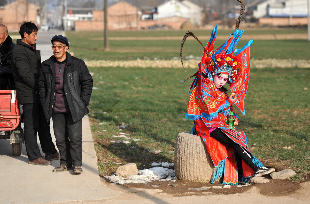 下午4点多,社火队已经转了两个村子约三百户人家,所有人还没有吃上一口饭。13岁的安英又累又饿,再也走不动,负责后勤的人拿出一盒糕点和一瓶饮料让她吃。图为安英坐在一个村口的石碾子上等待其他队员在村里巡游。