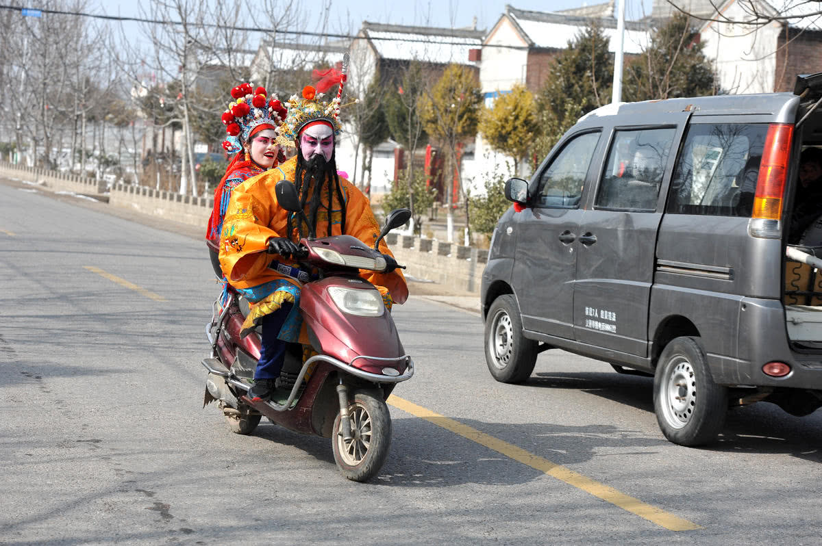 在转村途中,也有其他社火队员用讨巧的方式节省体力。图为一位扮演皇帝的队员,骑着摩托车驮着另一名女队员前往下一个村子。