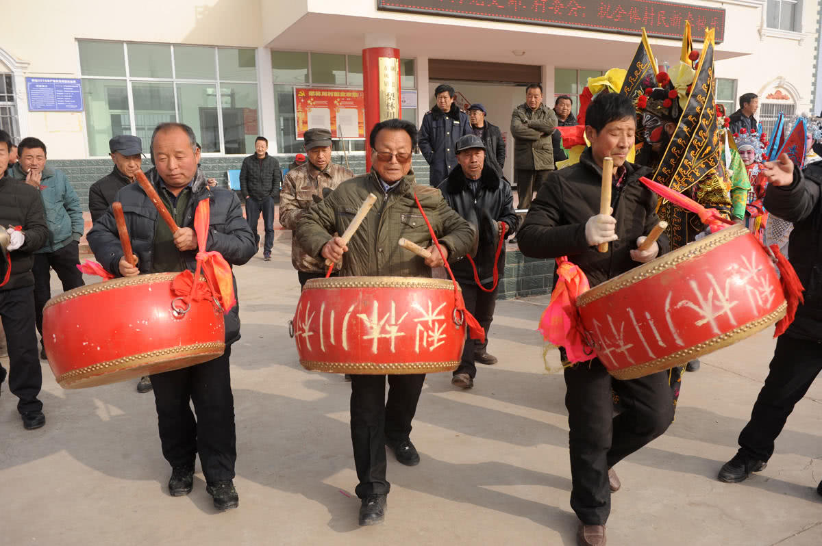梨林川村社火队扮演的有黑虎、灵官、财神、关公、穆桂英等等,这也是陇县社火中最常见的人物。他们都取材于神话、历史演义、民间传说故事,寄托着人们降妖驱魔、辟邪镇宅、安泰吉祥、祈福求祥的美好愿望和期盼。图为所有人都准备妥当后,乐队敲响锣鼓,社火队在村委会前巡游一圈后开始前往邻村。