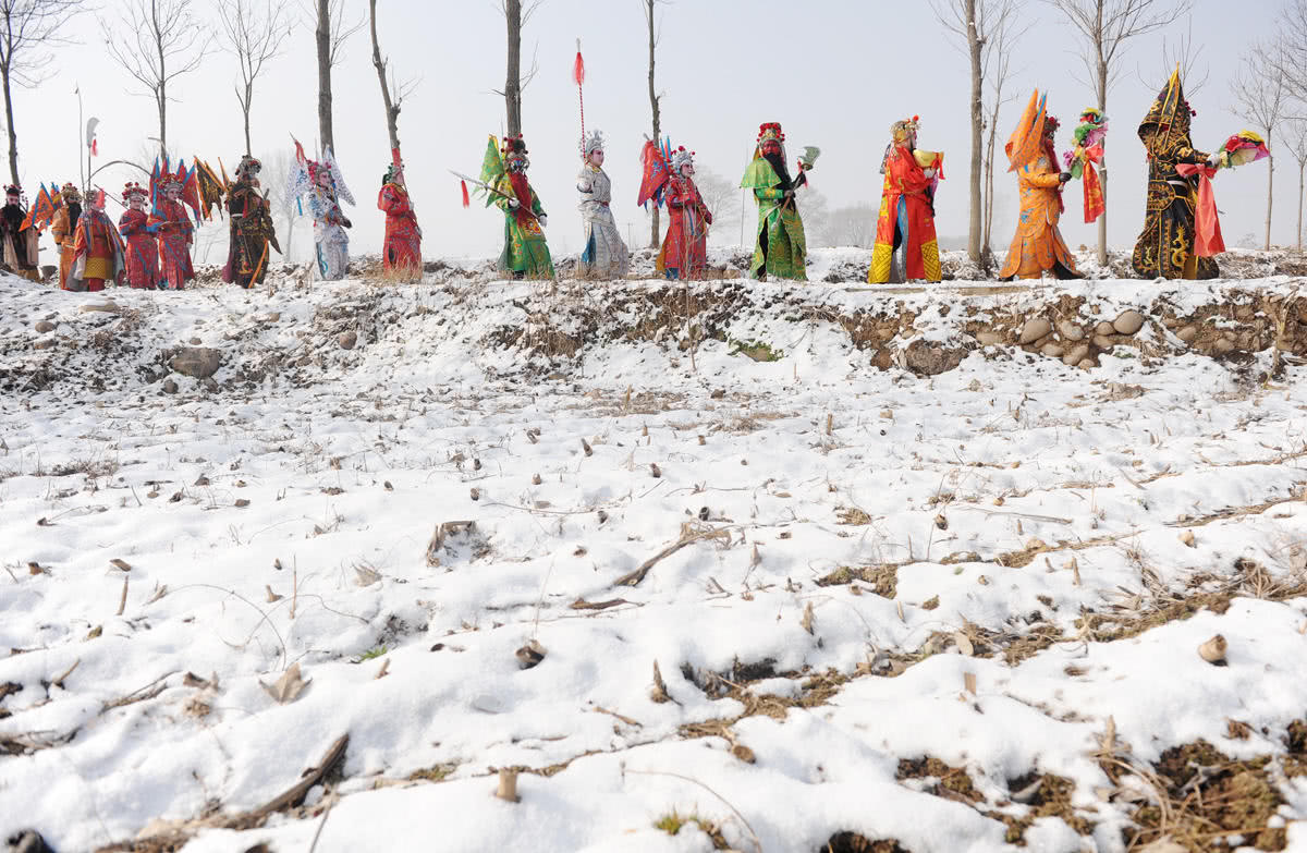 “社火” 是节日迎神赛会扮演的杂戏杂耍。起初,“社火”被称为“社虎”,之后逐渐演变成了迎春贺年的娱乐活动。陕西陇县被称为“社火之乡”。陇县社火起源于宋元,历史悠久,极富特色。每到春节,陇县大小村庄的社火队就开始物色人员,然后从大年初二开始,画脸置装、敲锣打鼓,风雪无阻地走街串巷为乡民祈福纳祥,直至正月十五后结束。图为东风镇梨林川村的社火队踏着积雪走在耍社火的路上。