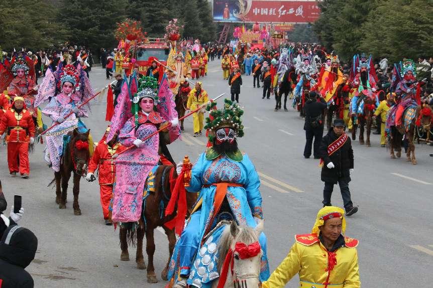 一大早,四面八方的群众纷纷涌向县城,距社火表演还有1个多小时,看社火的观众已沿街道两边筑起厚厚的人墙。上午10时整,社火游演正式开始,一时间,锣鼓震天,精心装扮的各式社火犹如一条开闸的彩色河流般铺展开来,黑虎与灵官走在队伍最前列,关羽、财神爷紧随其后,身着铠甲战袍的装扮者,手持刀、枪,骑骡坐马,雄姿猛健,威风凛凛,用鸡蛋皮做成的“疙瘩”贴在脸上,生动夸张,威武的雄狮前后跳跃,欢快的旱船来回穿梭,秧歌队的大婶们翩翩起舞。社火队伍中,一群百人少儿社火方阵成为全场焦点,孩子们扮演的“小关公”身穿绿袍,手持青龙偃月刀,威风凛凛,“小穆桂英”则身着战袍,手持长枪,英姿飒爽,格外吸引眼球。一辆辆装扮精美的车社火在绿树红花的掩映下,格外引人注目,充分展示了新时代新农村的新气象,装扮着战长沙、断桥、二进宫、杨门女将和黑虎搬三霄的社火角色,在震天的锣鼓声中向人们诉说着一段段历史经典。
