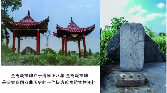 “金鸡”为旧时社戏所祀之神,属于道教文化的产物,来自艺术之神“二郎神座”下的“金鸡”和“玉犬”。怀宁县志载,“金鸡碑的立碑时间最晚应是清雍正八年(1730年),或者上到明代。”金鸡碑原临冶塘湖,湖之东南有黄山的象鼻嘴与正东的狮子山相望,有狮象把口的雄奇之势,口宽百余米,与皖河相通。相传当年班社乘船外出卖艺之前,必先到金鸡碑祭拜。