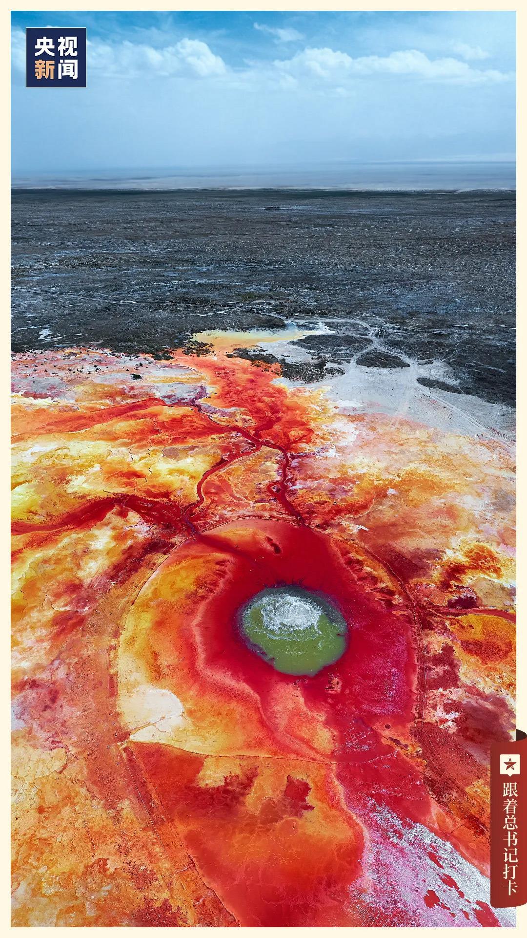 茫崖市有一个形如巨眼的艾肯泉,泉眼如同沸腾的开水,不断翻滚上涌,泉眼周围硫黄矿物质长期沉淀,形成斑斓的红褐色圆圈,从高空俯瞰像极了脉络清晰的眼睛,被称为“大地之眼”。