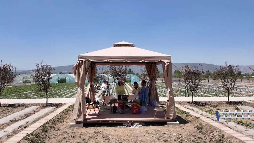 在占地100亩的“大田共享菜园”里,孩子们种植、施肥,学习移栽辣椒苗,欢快地展示刚采摘的樱桃萝卜。菜地露营区飘来阵阵香气,从种子到餐桌的全链条农耕,让每个家庭都体验到了收获的快乐。