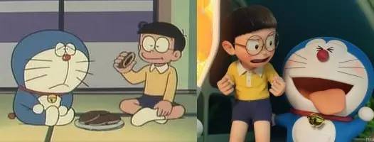 除了我们本土的动画片,霓虹国的经典动漫人物也在变。《哆啦A梦》里的大熊和小叮当面部不要太饱满~