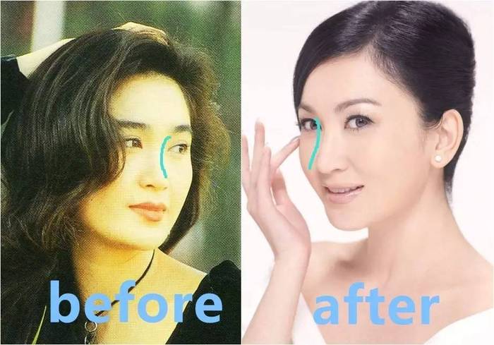 “第一妲己”温碧霞,也在颜值上下过功夫。早期的她看起来还比较温柔,因为鼻梁比较低。悄悄垫高鼻梁之后,脸上的妩媚气息也重了些