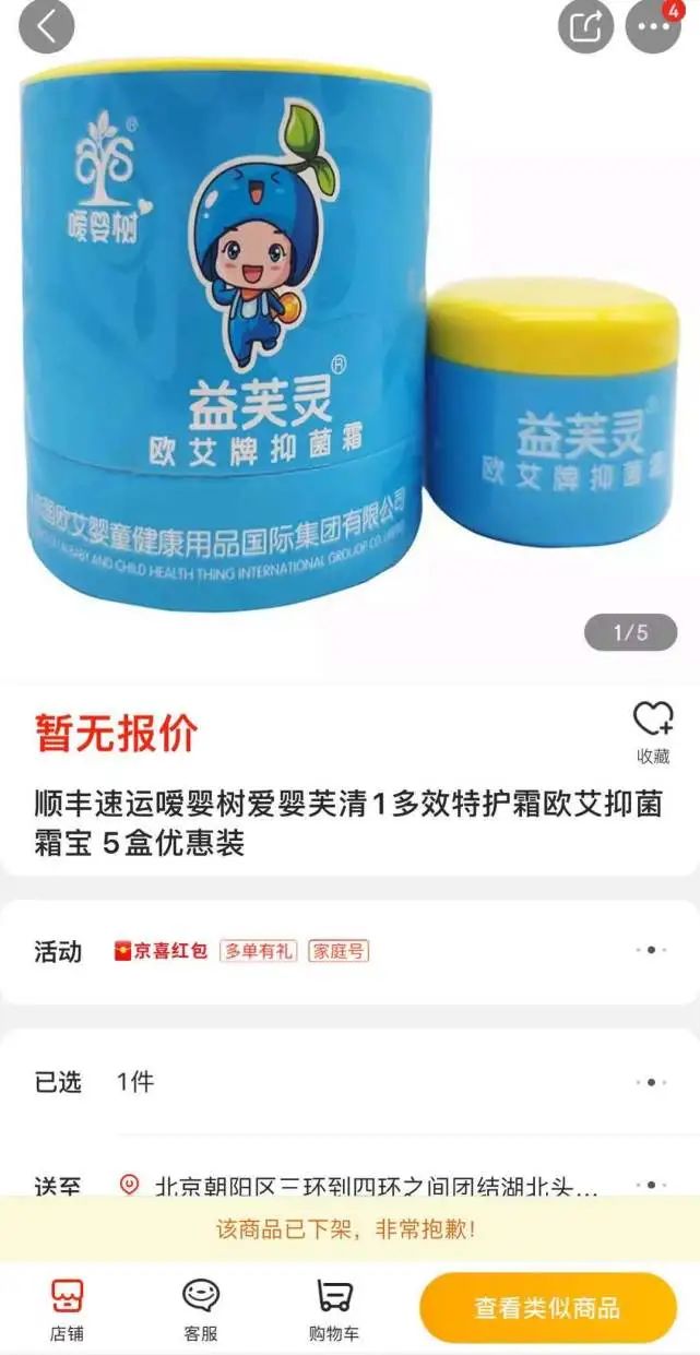 1月8日,北青-北京头条记者了解到,涉事宝宝霜系福建欧艾婴童健康护理用品有限公司所生产的益芙灵欧艾牌抑菌霜。