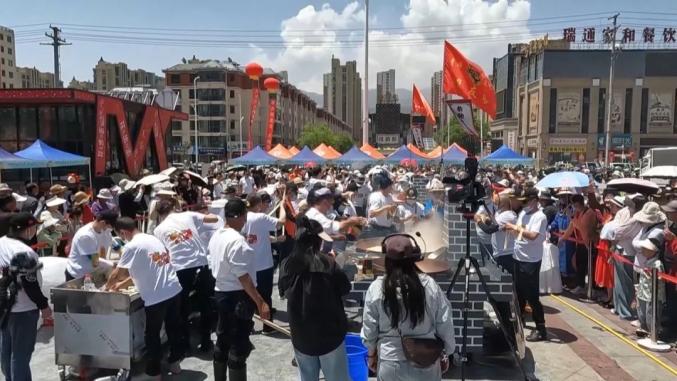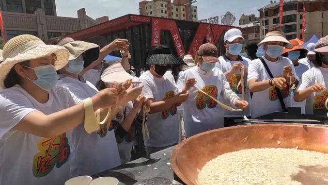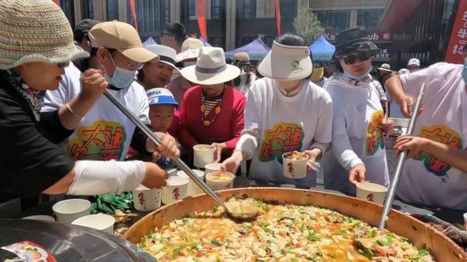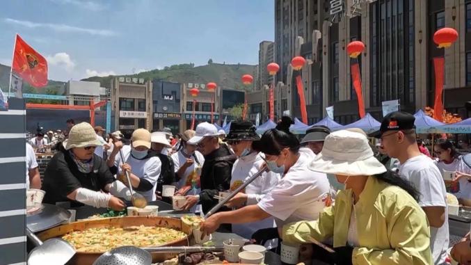 活动现场,6口直径1.2米的大铜锅架设在仿长城烽火台造型的灶台上,成为亮眼地标。厨艺高手们施展精湛技艺,揉面、切面、揪片、烹煮一气呵成,热腾腾的面片搭配鲜香浓郁的臊子,勾起观众味蕾记忆。与此同时,民族舞蹈《河湟情韵》灵动飘逸,“花儿”演唱高亢嘹亮,文艺表演与美食体验交相辉映,让现场千余名观众沉浸式感受河湟文化的多元魅力。