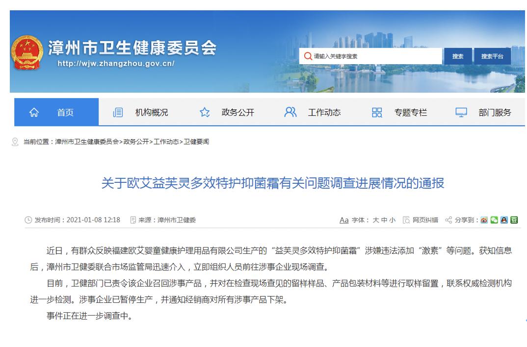 1月8日,福建漳州市卫健委发布了相关通报称,在获知信息后,漳州市卫健委联合市场监管局迅速介入,立即组织人员前往涉事企业现场调查。目前,卫健部门已责令该企业召回涉事产品,并对在检查现场查见的留样样品、产品包装材料等进行取样留置,联系权威检测机构进一步检测。涉事企业已暂停生产,并通知经销商对所有涉事产品下架。事件正在进一步调查中。