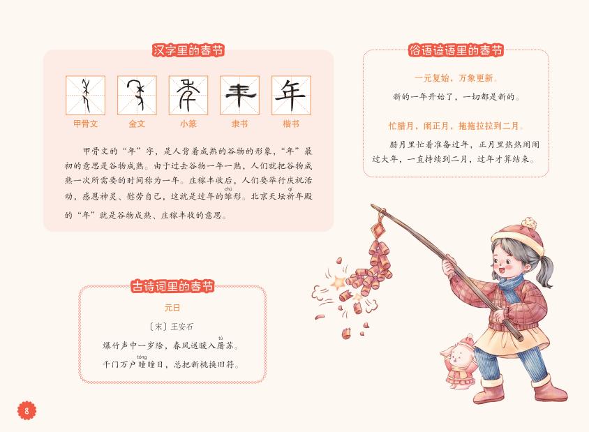 丰富多彩的节日活动为制作一本有意思、有趣的节日书奠定了扎实的基础。只要我们用合适的形式把节日本来就有意思、有趣的内容呈现出来,这本书就会是有意思、有趣的。为此,我们设置了节日传说、节日动动手、节日里的科学知识、节日习俗、汉字里的节日、俗语谚语里的节日、古诗词里的节日等多个板块,拓展读者对节日的认识和理解。尤其“节日里的科学知识”,能够启发、引导读者发现、探索生活中的智慧;“节日动动手”,能够引导读者亲自参与节日习俗活动,感受节日习俗的活泼可爱。