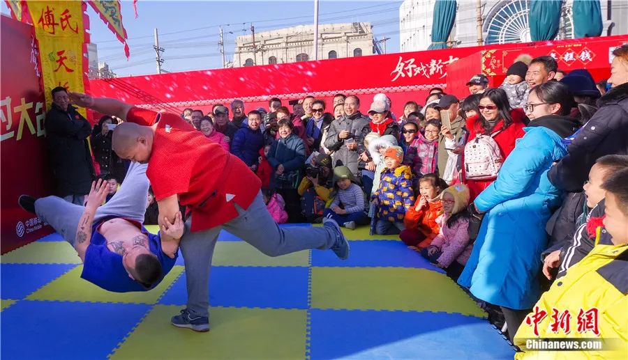2018年春节,北京厂甸庙会的传统摔跤表演。贾天勇 摄