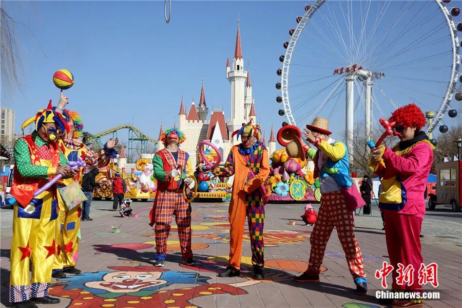 2018年2月,小丑在北京石景山游乐园“洋庙会”表演。任海霞 摄