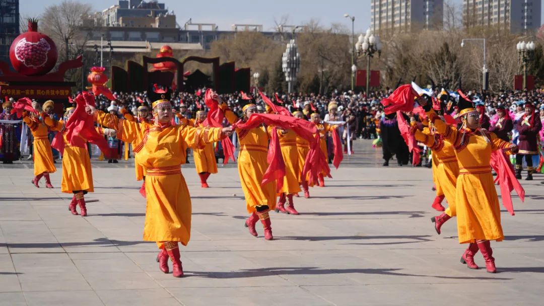 中午十二点,社火调演正式开始,肃南县社火队在第二顺位登场。三百余名各族儿女身着盛装款款而来,他们手中道具轻摇,足下皮靴踏响,仿佛祁连山涧解冻的溪流正在欢唱。整场演出独具特色精彩纷呈,隆隆的鹿角鼓声响彻天地之间,裕固族姑娘身着火红的长袍在阳光下摇曳生姿,藏族小伙的氆氇藏袍翻涌着墨色浪纹,蒙古族舞者腰间的彩绸如虹霓缠绕,不同民族的服饰相映成趣,正如那抱团生长的石榴籽,在祁连山的怀抱里酝酿着甜蜜的明天。当《民族团结一家亲》的旋律响起时,表演达到高潮。各族演员围绕着石榴雕像翩然起舞,每一个舞步都在诉说“中华民族共同体”的隽永诗篇。精彩的演出引得围观群众自发打起节拍,不断送上掌声与喝彩声。