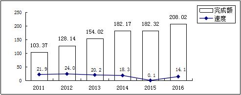 2011-2016年固定资产投资额及增速