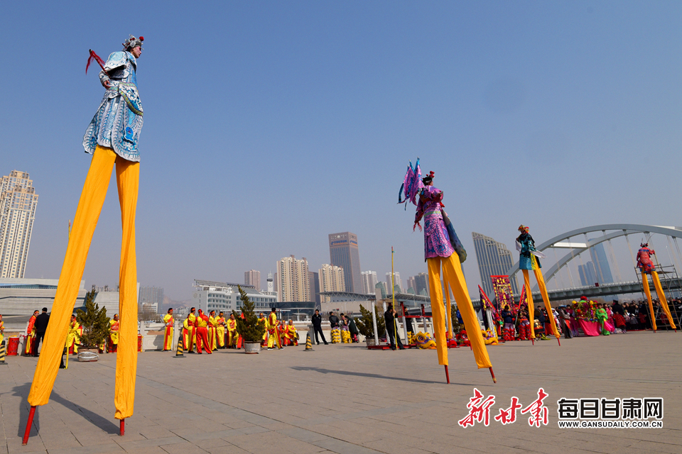兰州太平鼓响起来,永登苦水高高跷走起来……今日11时开始到13时,在兰州市城关区金城关文化博览园广场及兰州市水车博览园,来自兰州市部分县区的社火队纷纷亮出了“拿手戏”,和围观的市民们一起“闹”元宵节。