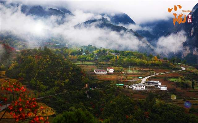 远处群山连绵起伏、笼罩在一层薄薄的雾中,若隐若现,和五彩斑斓的村庄相互映衬,犹如一幅古朴淡雅的乡村写意画。