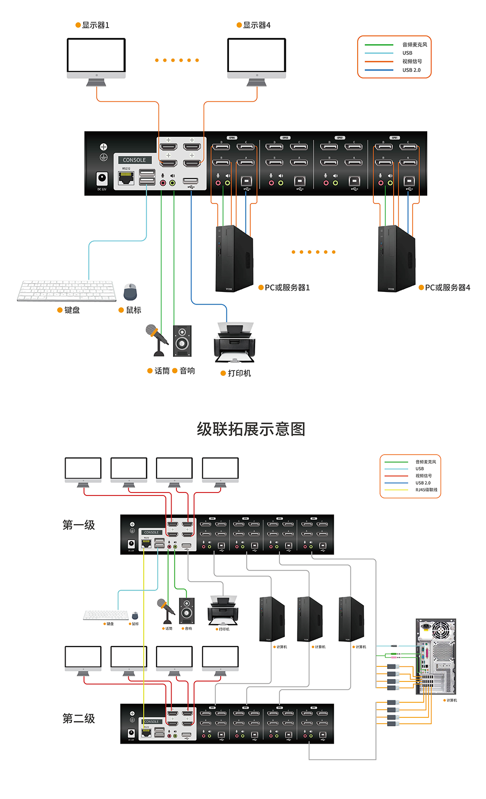 一套USB键盘/鼠标控制四台多显示(2/3/4)接口的计算机,通过设备级联,最多可控制四台8显示接口(HDMI或者DP)的计算机