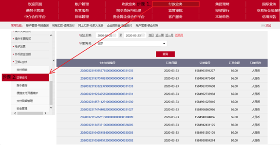 ②订单支付经办操作完成后,您登录工行网银选择“付款业务->工银e企付->指令查询”的菜单,选择对应的付款记录进行付款审批。