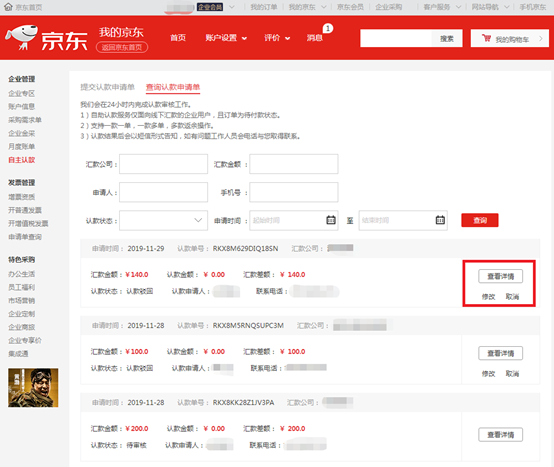 申请单状态包括,全部申请看可进行“查看详情”操作,仅其中认款驳回状态的申请可进行“修改”、“取消”操作(修改操作即修改认款信息重新提交一次,原申请单不再保留)